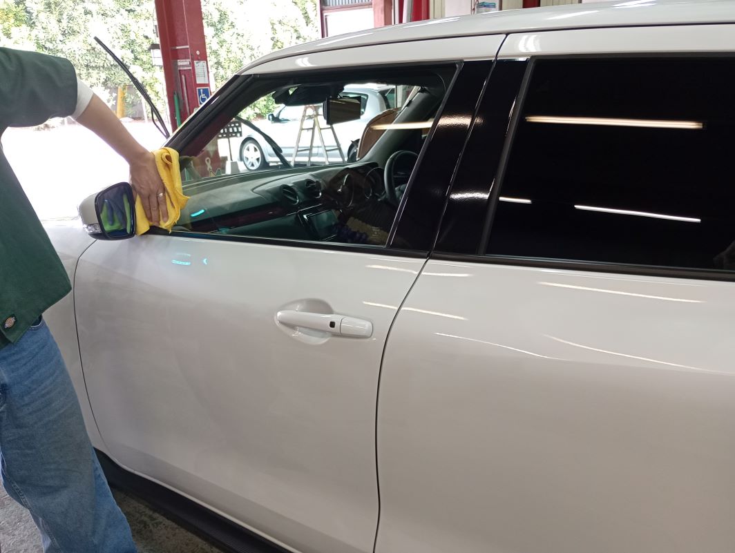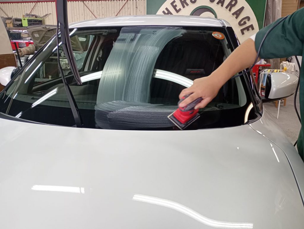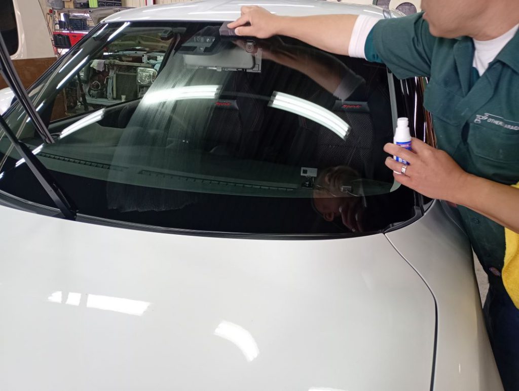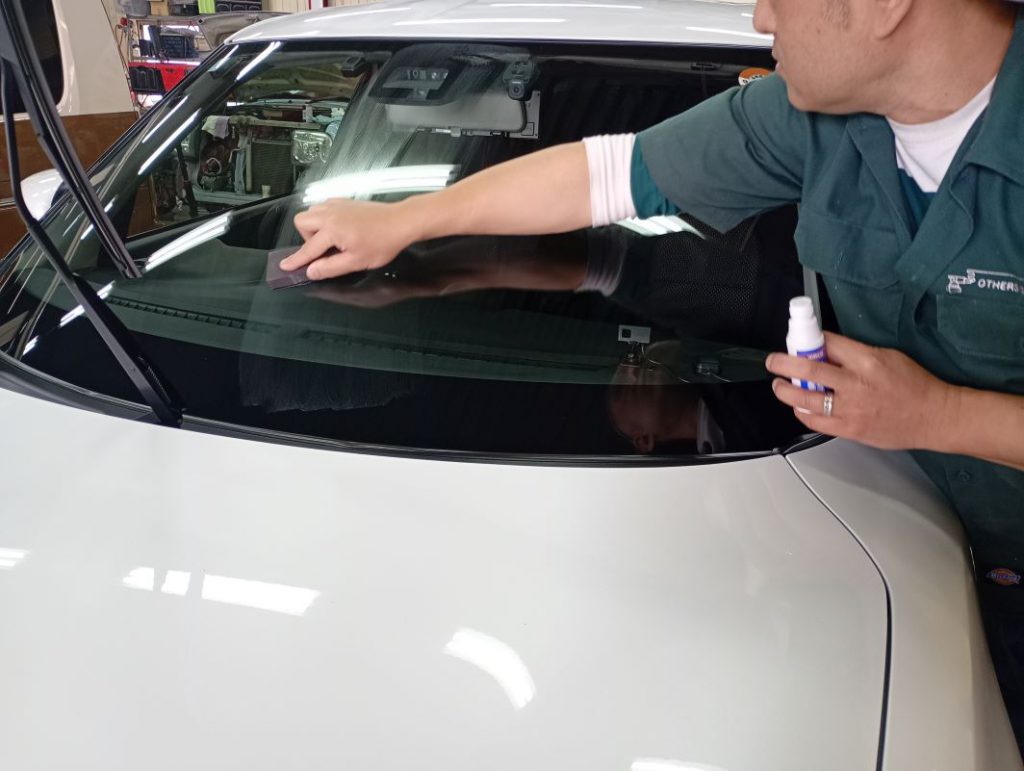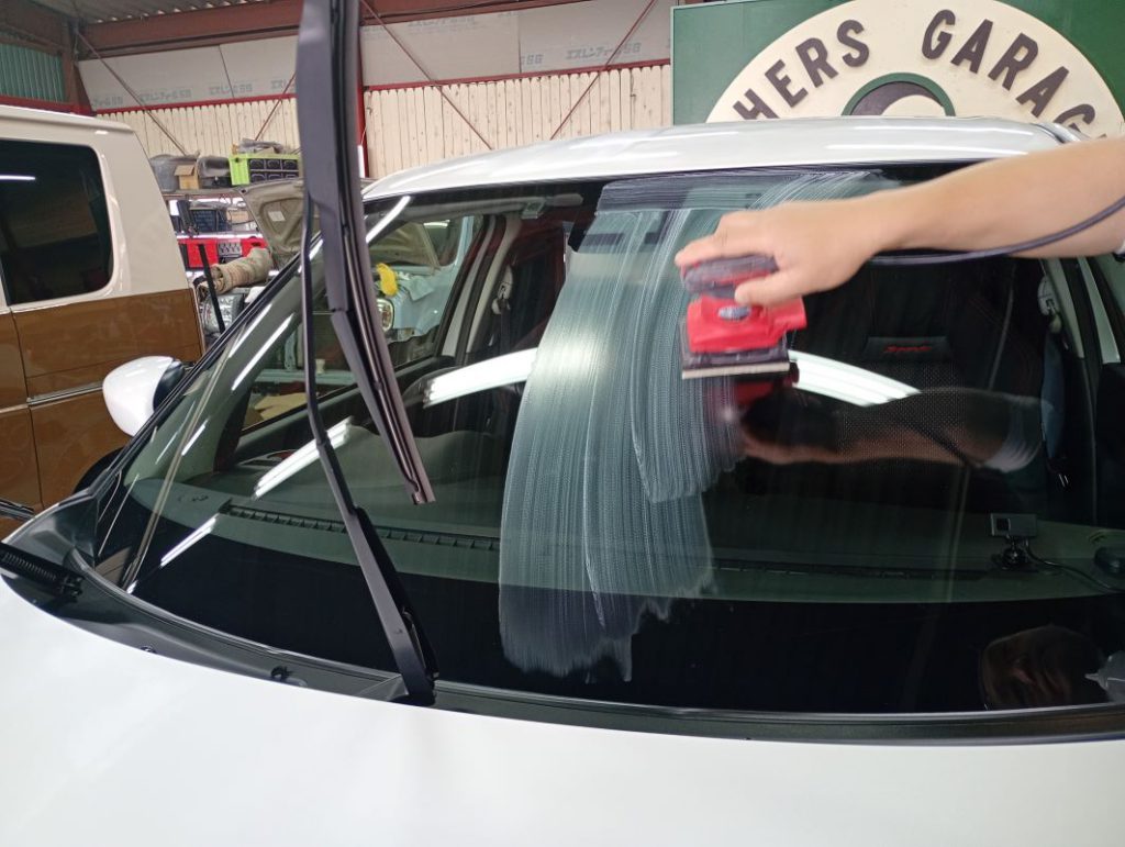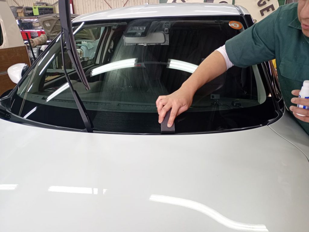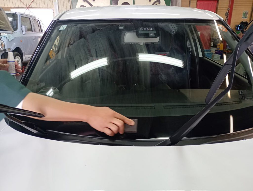 フロントガラスのみ水垢とり作業の様子。